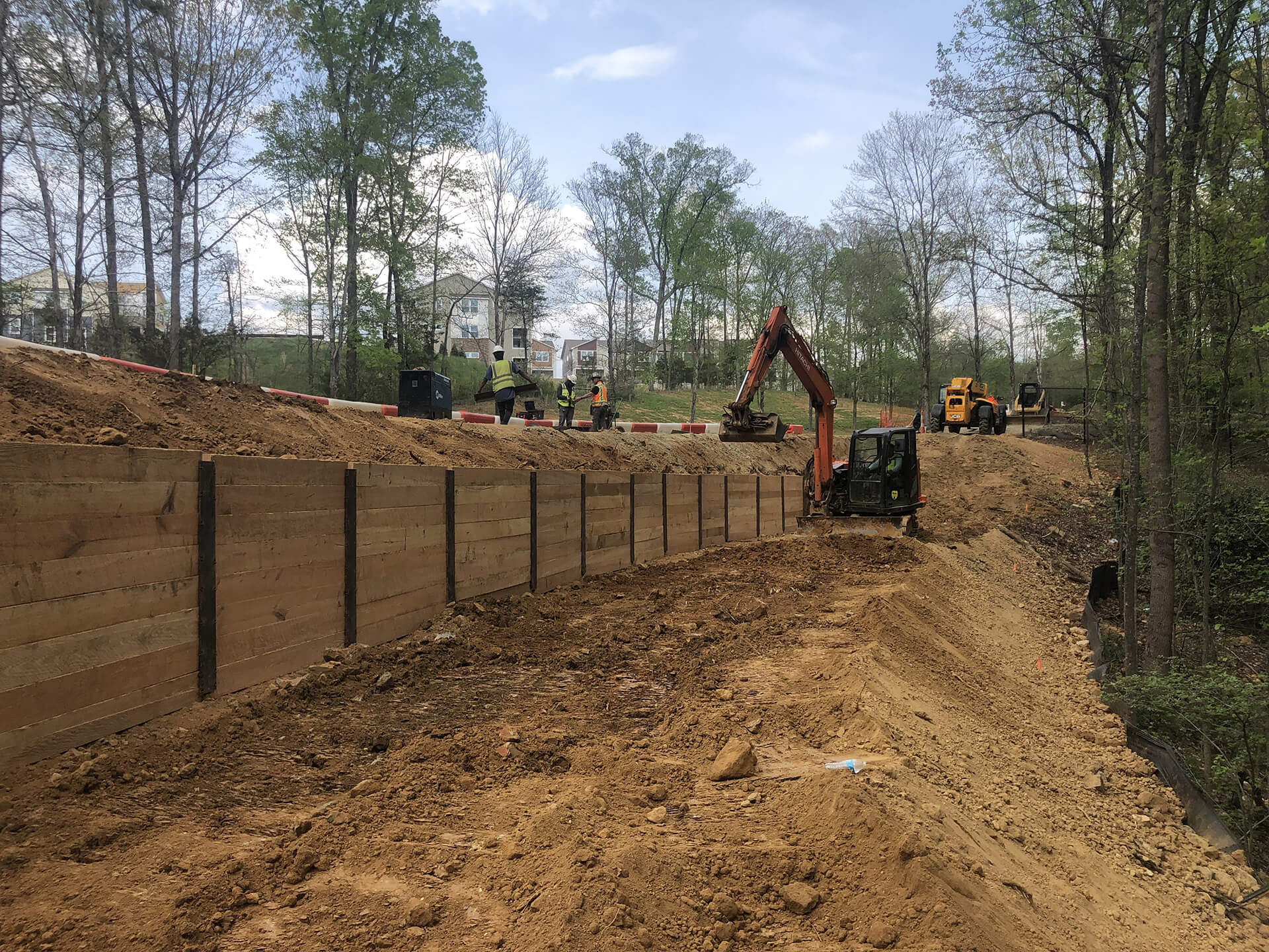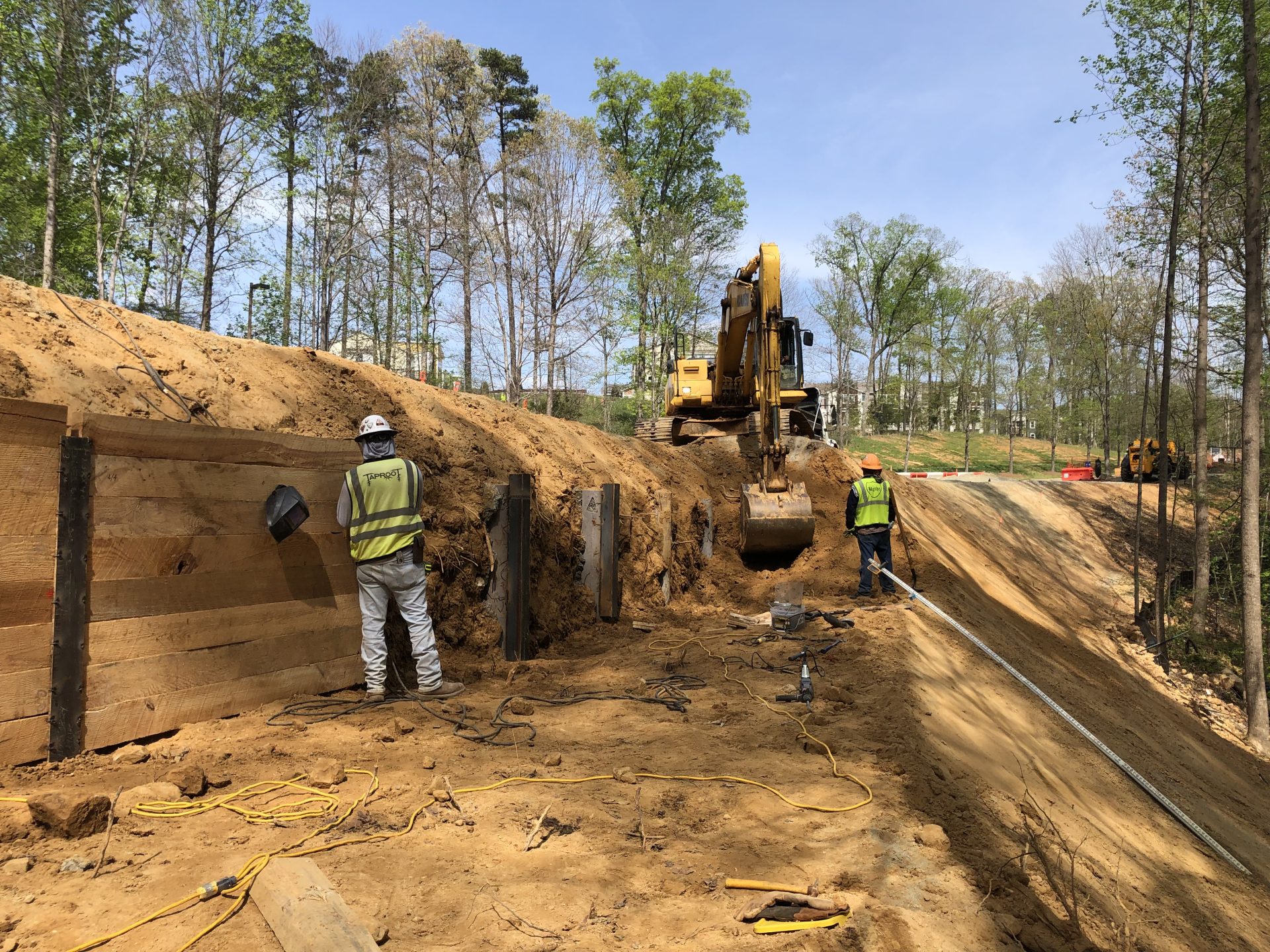 Taproot installed a temporary drilled casing and lagging wall to meet the project’s excavation support needs. The presence of shallow partially weathered rock (PWR) within the pile embedment zone presented drilling challenges that ruled out conventional soldier pile installation. Instead, Taproot utilized cased drilling methods to maintain hole integrity through the variable subsurface conditions, followed by timber lagging as excavation progressed in lifts.