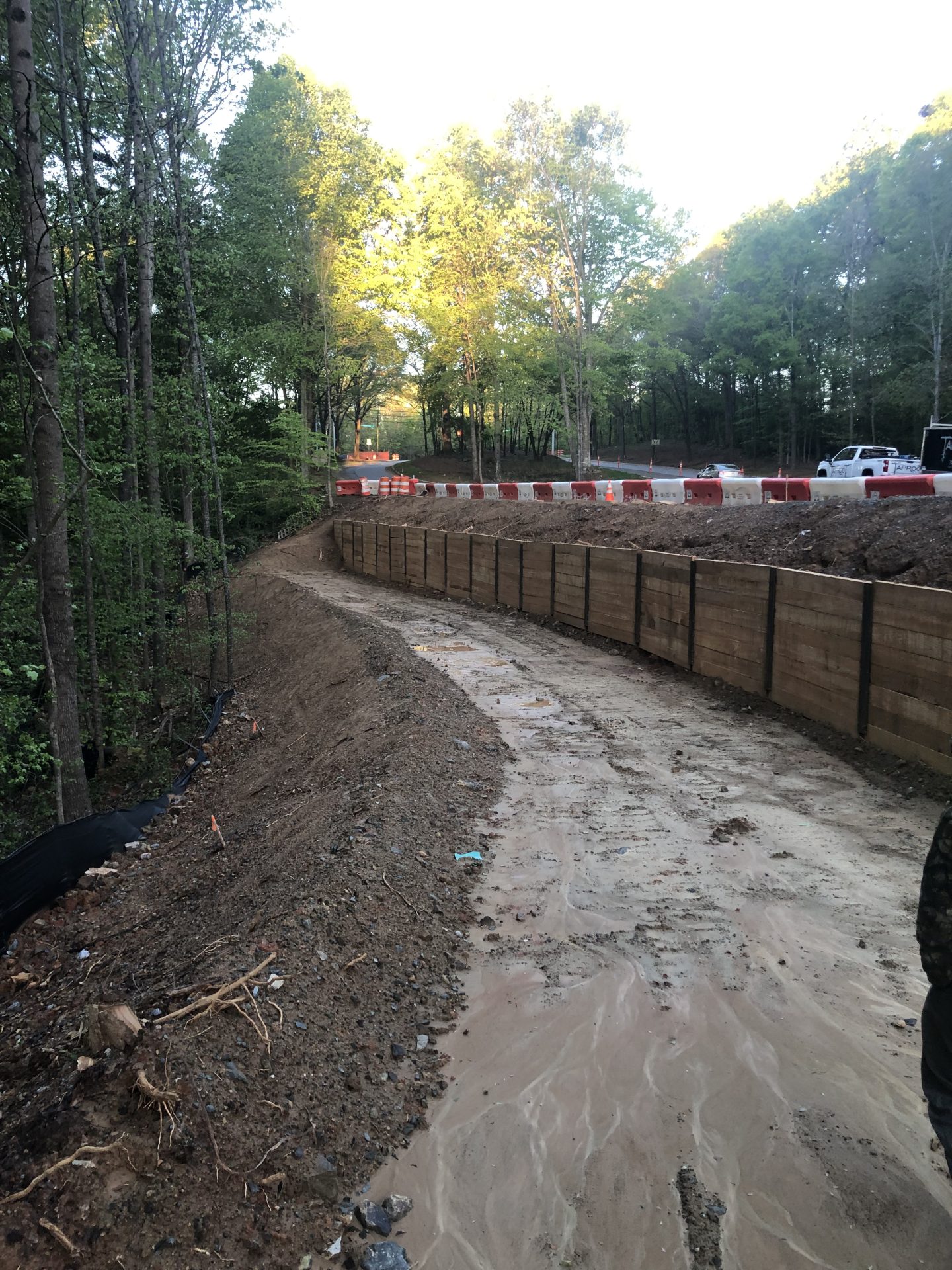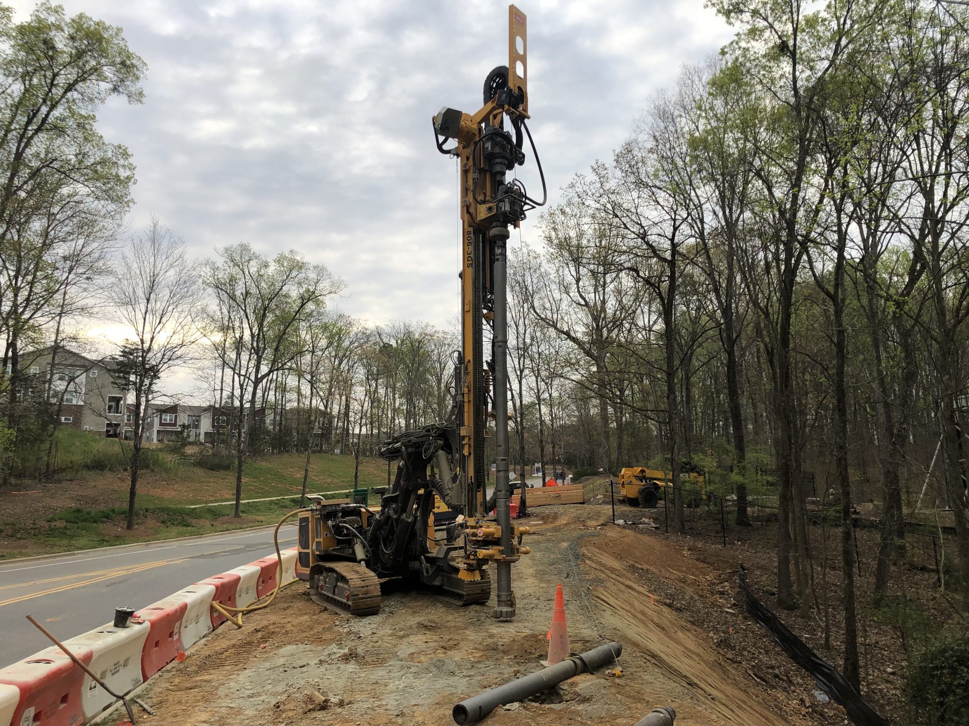 Taproot Construction was engaged to install a temporary earth retention system to facilitate construction of a cast-in-place concrete retaining wall at the Centene campus in Charlotte, North Carolina. The wall was located adjacent to an active roadway, which needed to remain open throughout construction. Due to limited space and the inability to lay back the excavation, a vertical support solution was required to allow safe installation of the retaining wall footing.