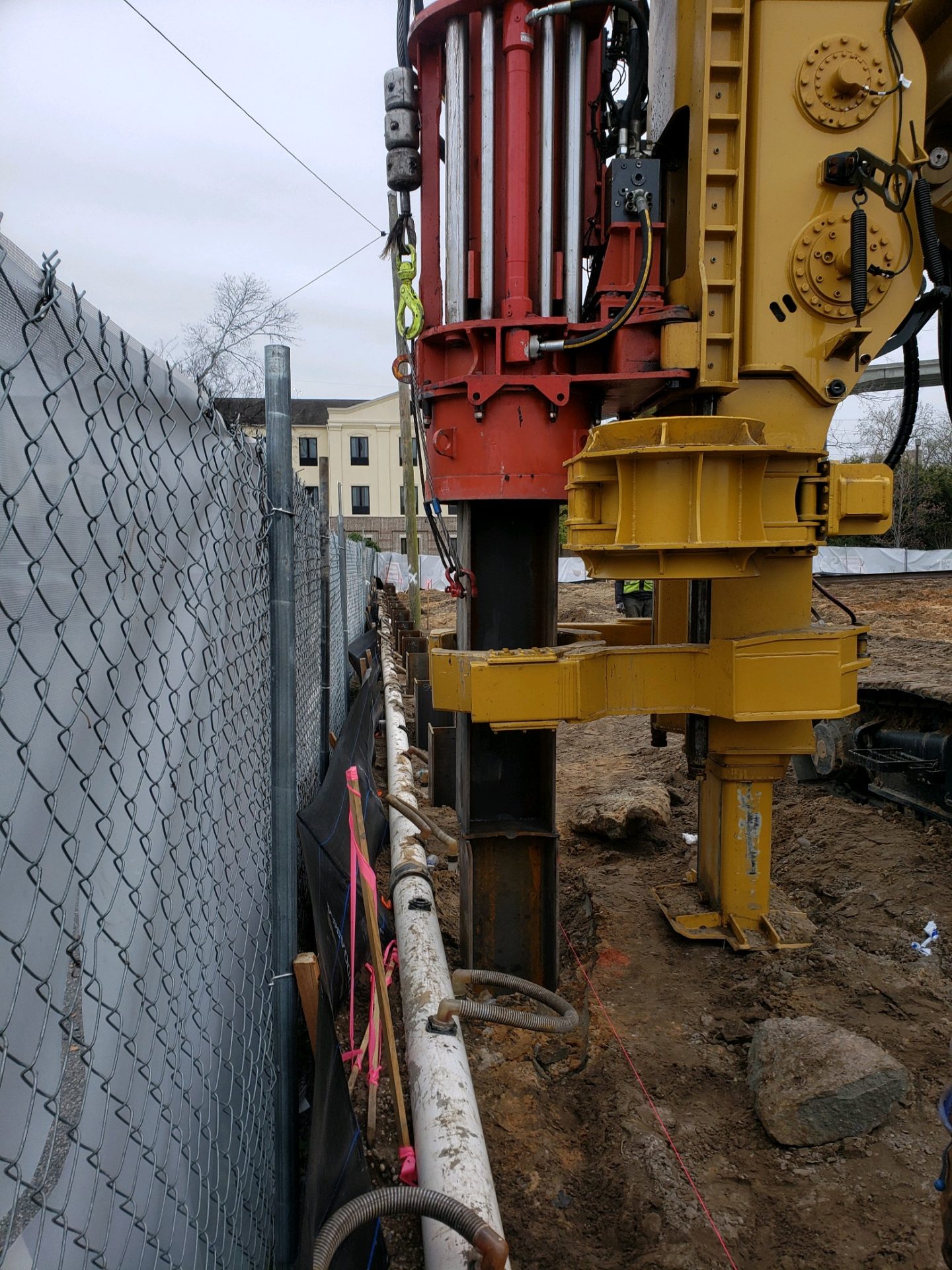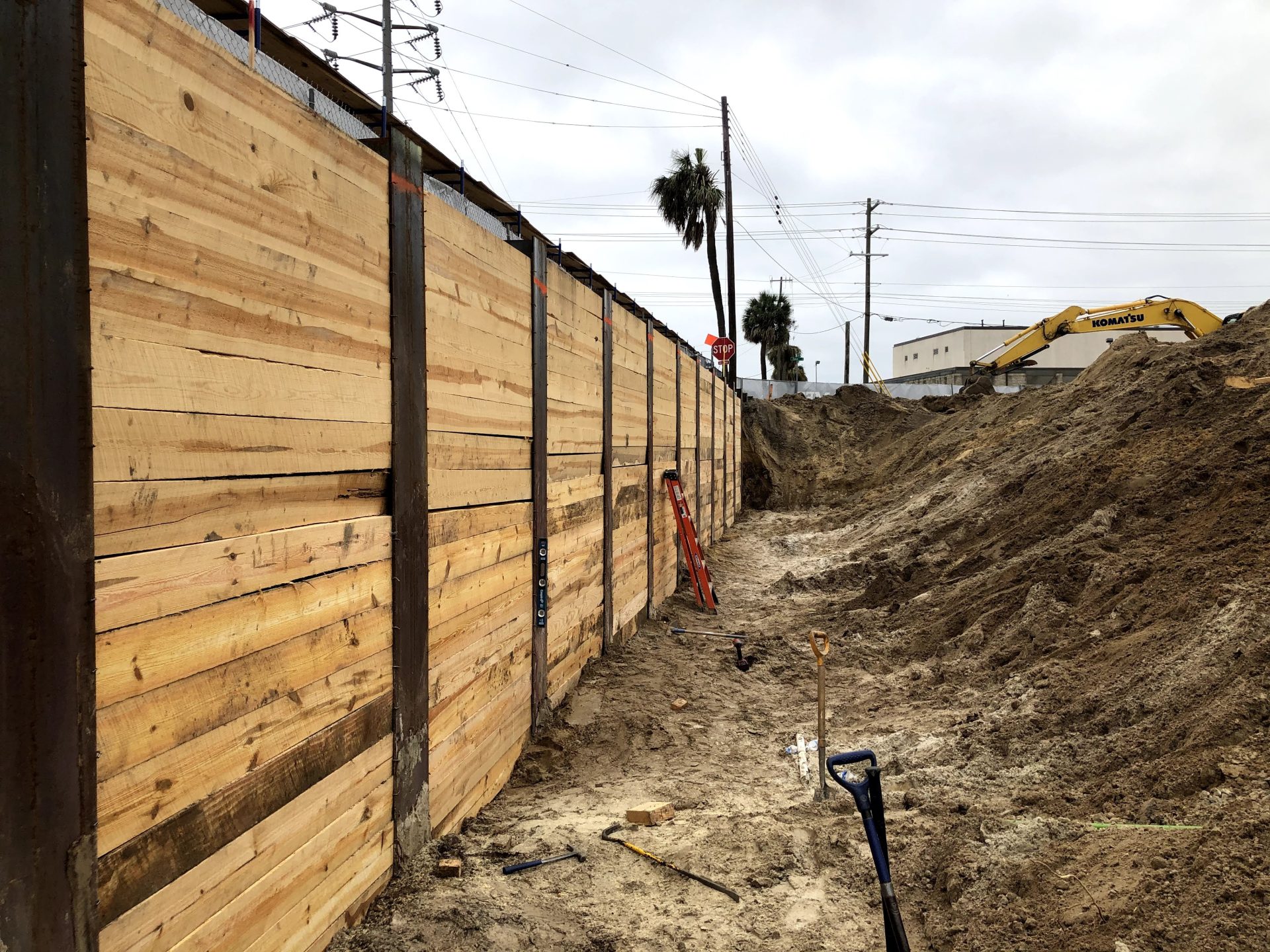 The support of excavation totaled approximately 8,900 square feet and retained cuts ranging from 11 to 13 feet below existing grade. Soldier piles were driven using a hydraulic hammer and installed to the required tip elevation to provide full support during excavation. As the soil was excavated in five-foot lifts, timber lagging was installed between the piles to maintain earth retention and protect adjacent structures and utilities.