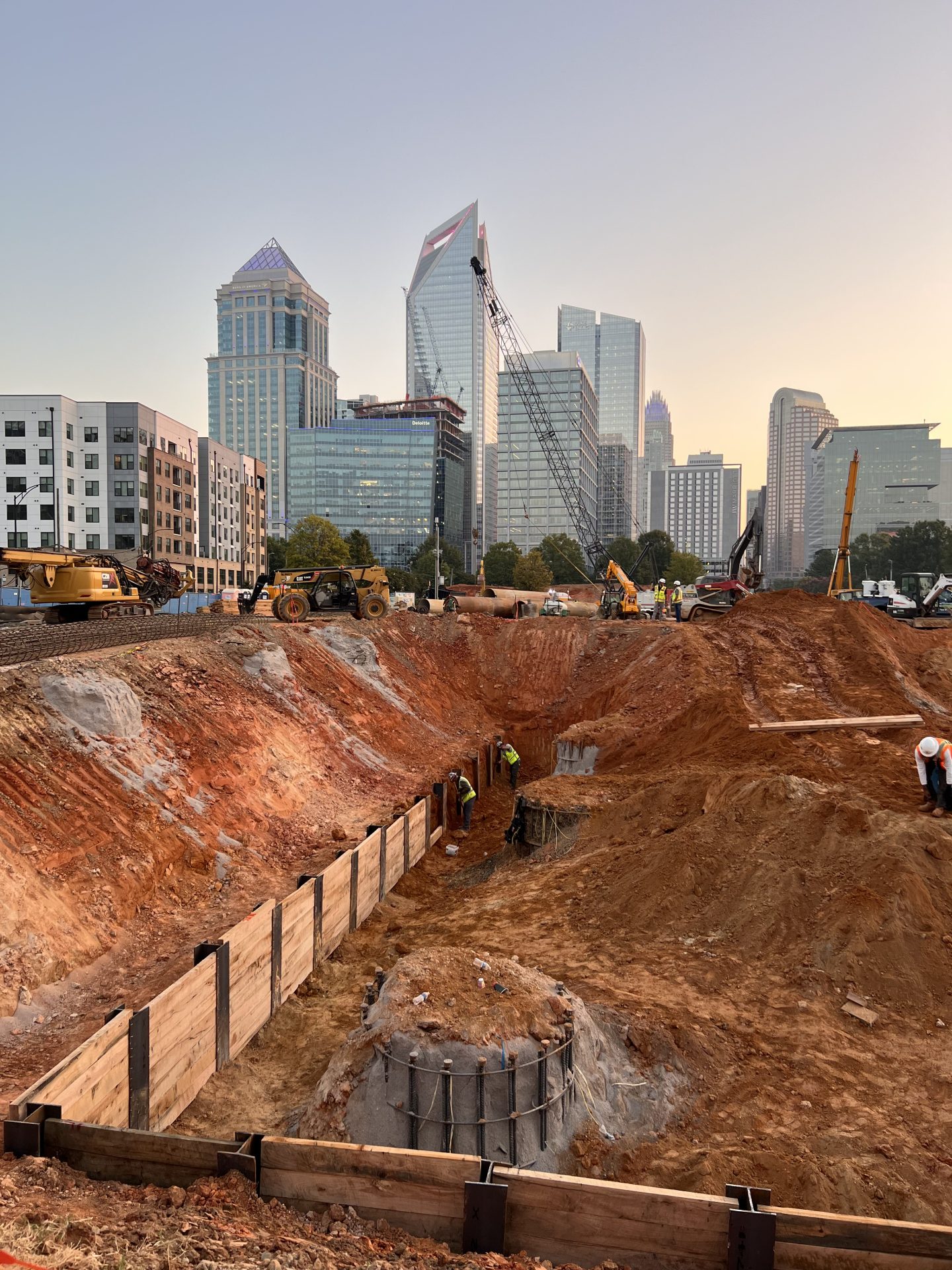 As part of the signature Queensbridge Collective development in Charlotte’s South End, Taproot Construction was selected to install a driven soldier pile and lagging wall supporting excavation for the foundation of Tower 1. The four-sided earth retention system was designed to accommodate construction of a 10-foot-thick mat footing that will support the new 42-story residential high-rise.
